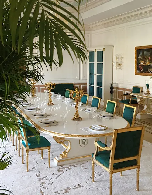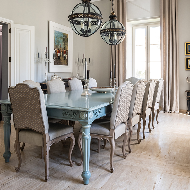 Une table d’apparat pour une salle-à-manger d’exception. Table baroque, réf. 751, déclinée en 5,6 mètres de long sur 1,8 mètre de large.