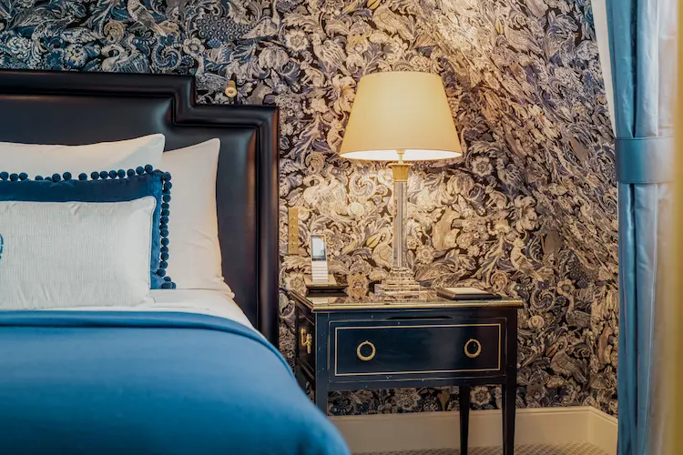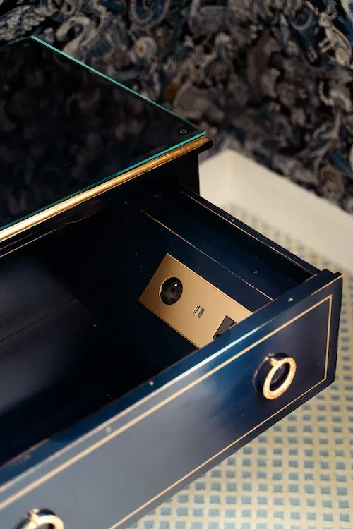 Pour l’Hôtel 1 place Vendôme, le mobilier a été travaillé sur mesure. Ici, les chevets, réf. 772, ne disposent que d’un tiroir, lui même équipé d’éléments connectiques pour recharger téléphones, ordinateurs et autres tablettes.