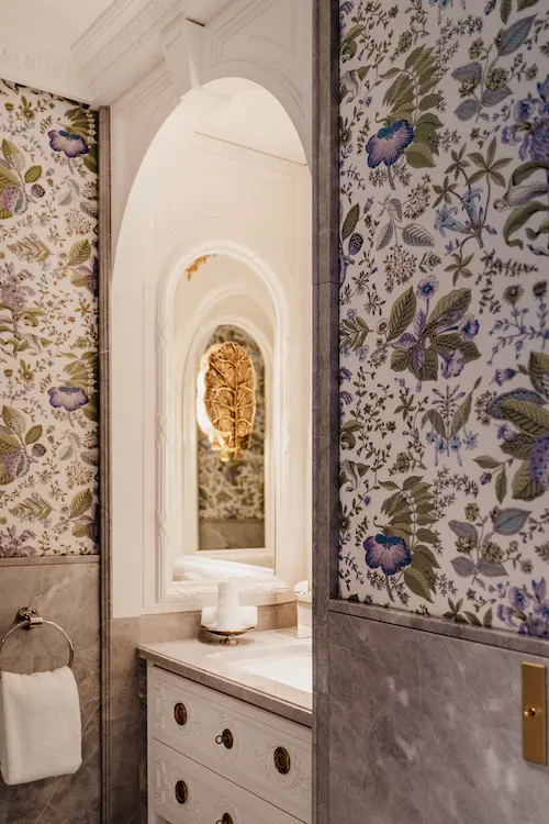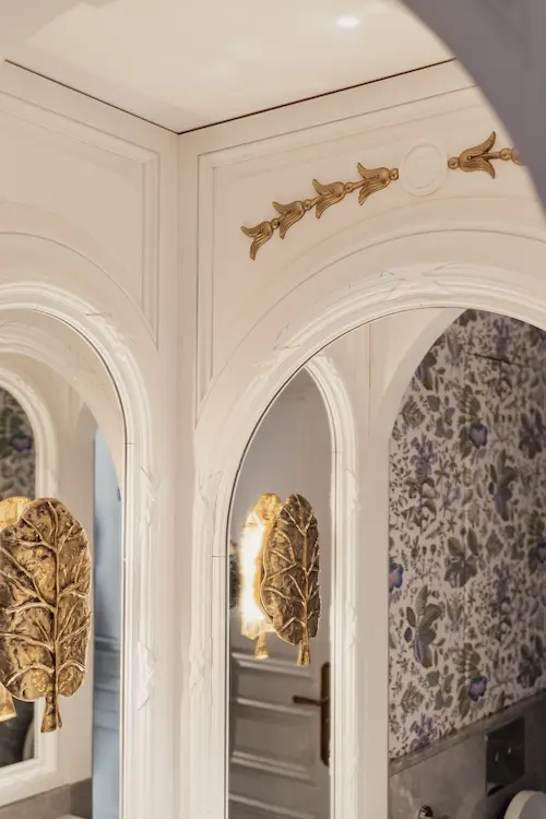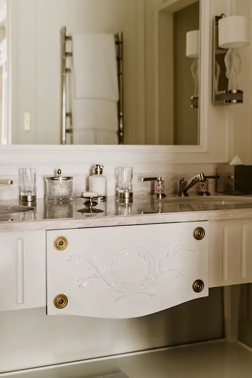 Alcôve disposant de trois miroirs de boiserie, avec belle moulure à décor de noeuds sculptés, inspirée du modèle réf. 801. Meuble vasque sur-mesure inspiré de la commode Fragonard, réf. 535, richement sculptée.