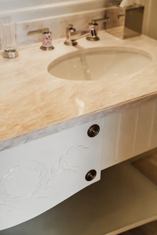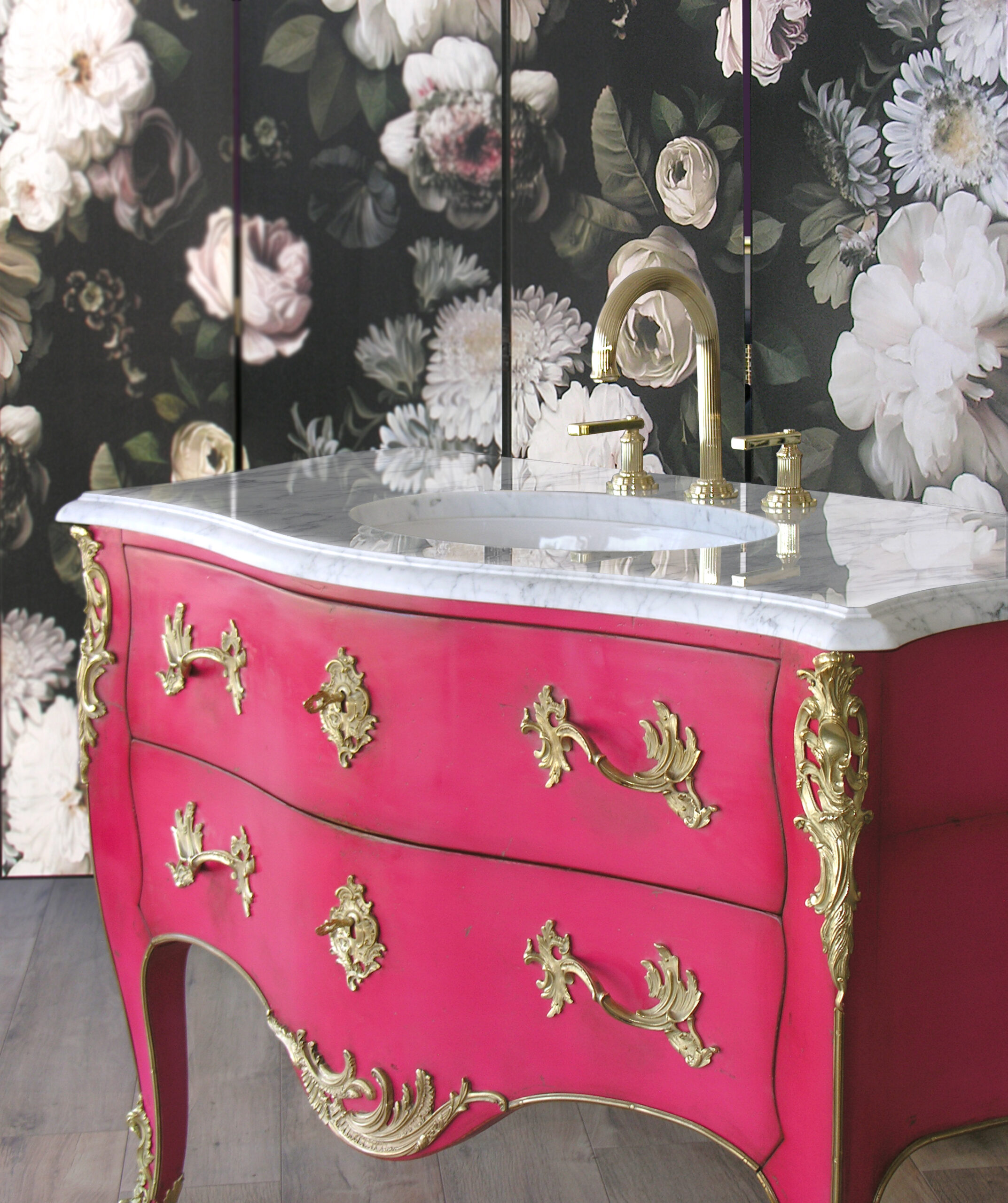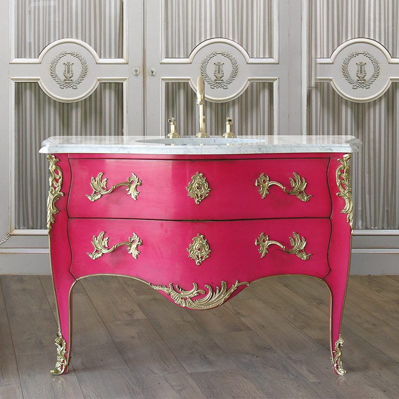 Quand notre iconique commode Louis XV, réf. 573, se transforme et devient par la magie de nos savoir-faire un meuble vasque. Traitée pour un usage en pièce humide, la commode dispose de tiroirs sur coulisses métalliques, pour un usage facile et moderne.