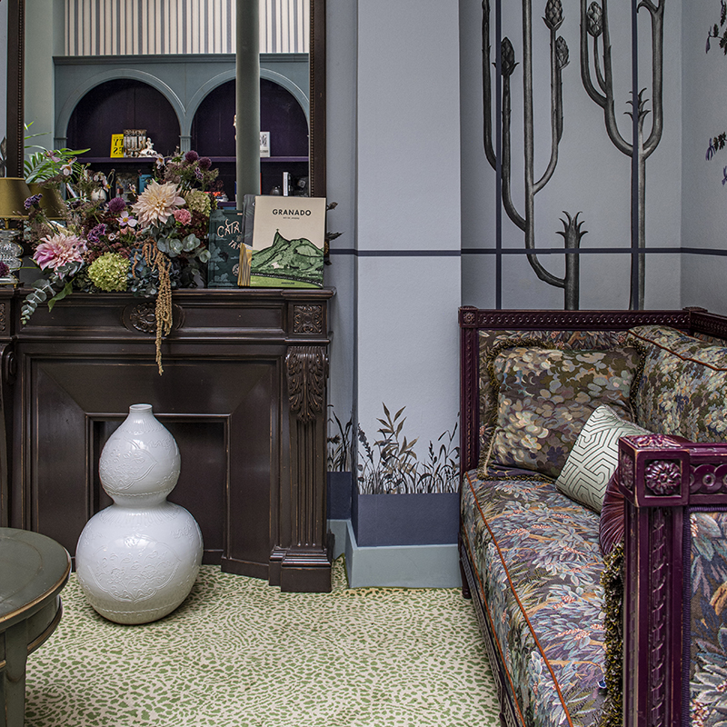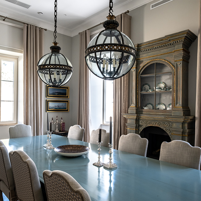 Déclinée en bleu Baltique et en dimensions sur-mesure, la table Napoléon III, réf. 757, réhausse l’ambiance feutrée de la pièce.