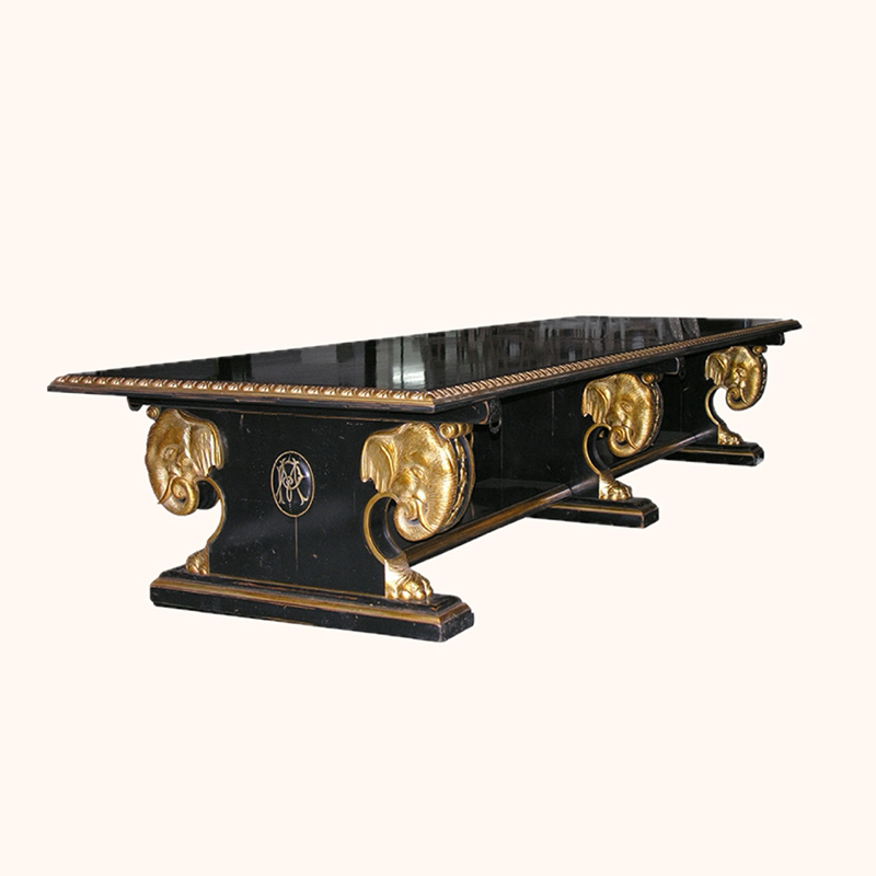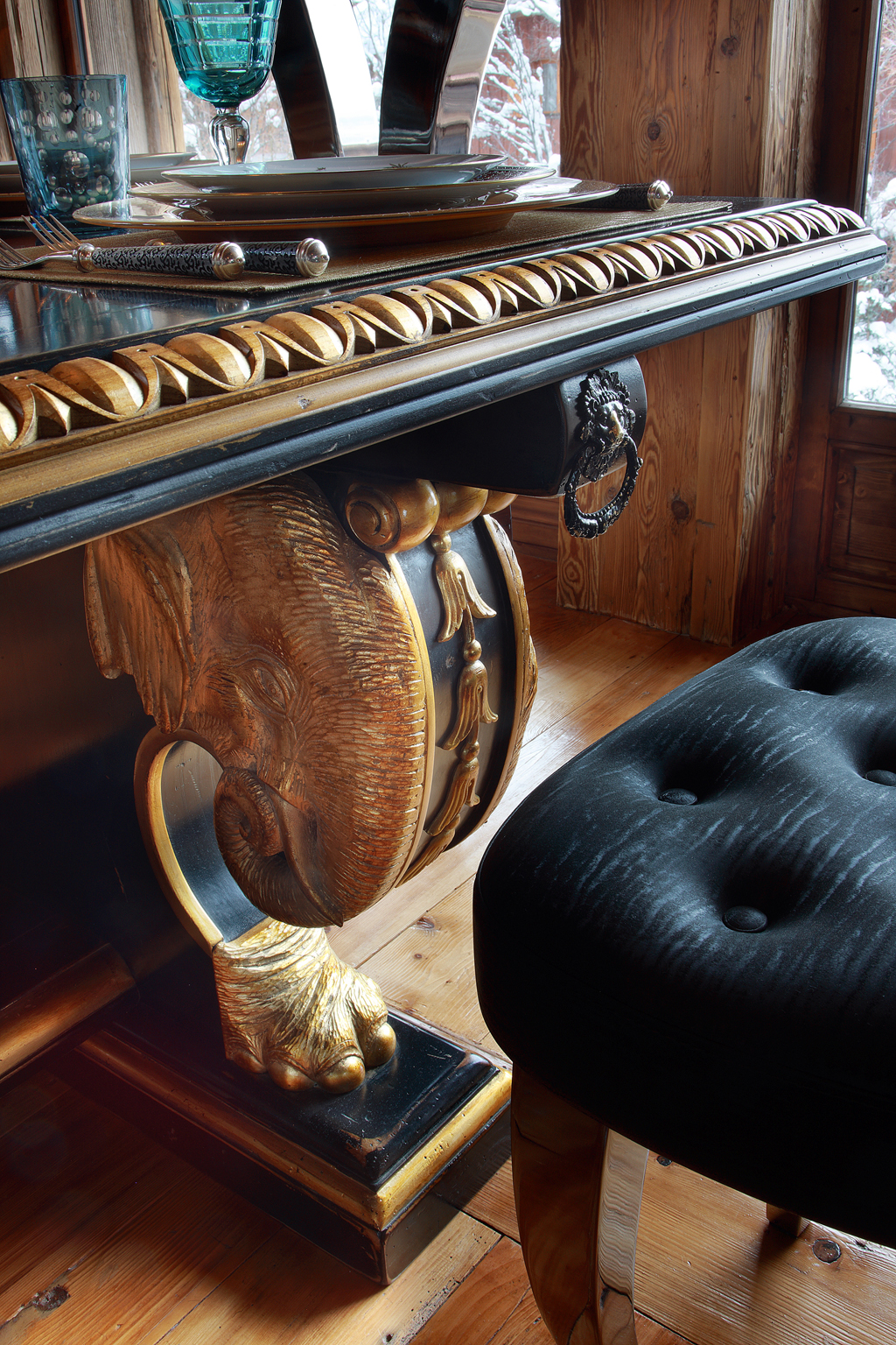 Inspirée de notre modèle de table baroque, réf. 751, la table dite « Marco Polo » dispose de six têtes et pieds d’éléphant sculptés à la main, et dorés à la feuille. Un travail de longue haleine pour un chalet dans les Alpes.