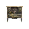 Hand painted Chinese decor. Two drawers. One flap lined in leather. Six small innerdrawers and one compartment. Curved feet. Style bronze.