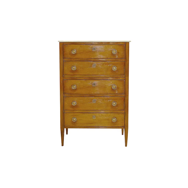 Special order. Special dimensions. Five drawers, white marble top, ribbed legs.