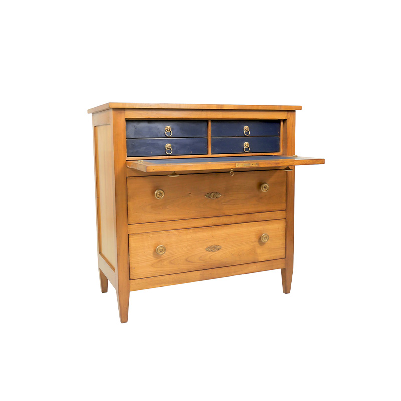 Three drawers with one forming a flap lined in leather, four small internal drawers.