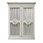 With baseboard, two glazed doors, moulding, central cross-pieces decorated with bronze laurel wreaths and lyre, upper cross-piece with bronze roundels, four interior shelves on support rails.