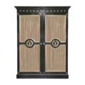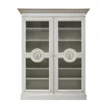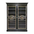 With baseboard, two glazed doors, moulding, central cross-pieces decorated with bronze laurel wreaths and lyre, upper cross-piece with bronze roundels, four interior shelves on support rails.