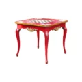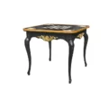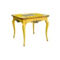 Cabriole legs, apron decorated with a bronze shell, reversible top: one side has painted chess board and cards decoration. The other side is lined in leather.