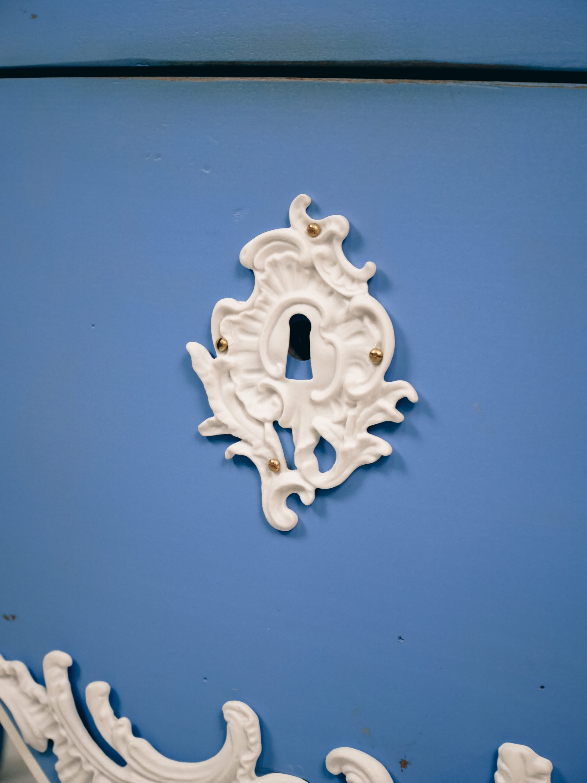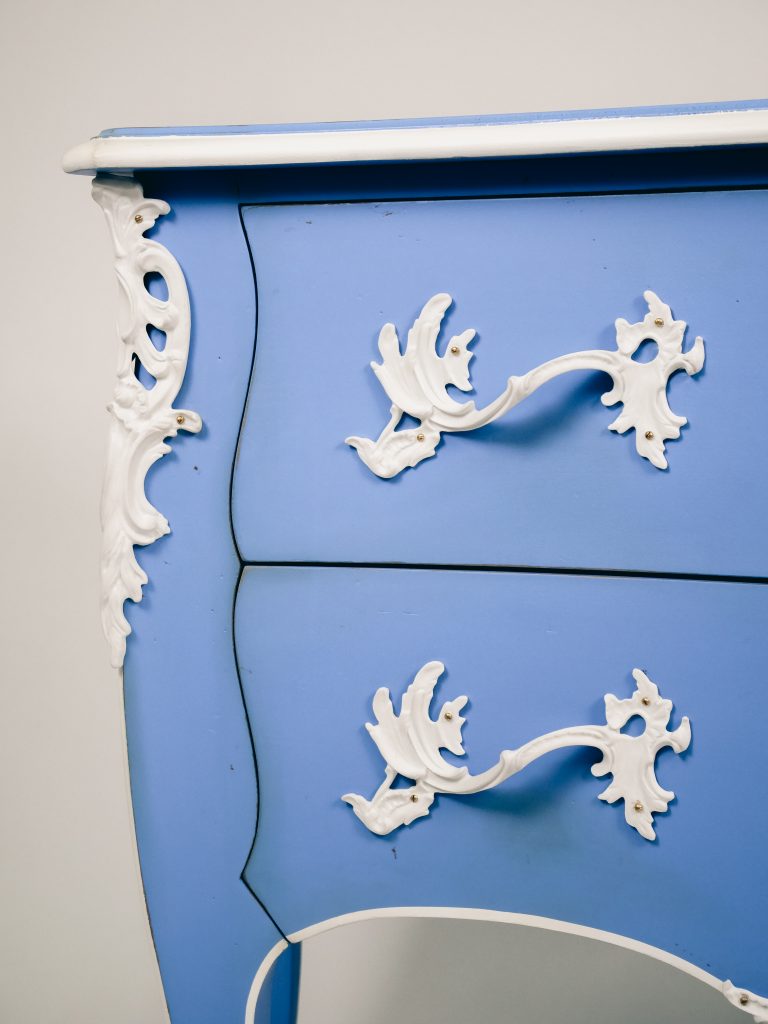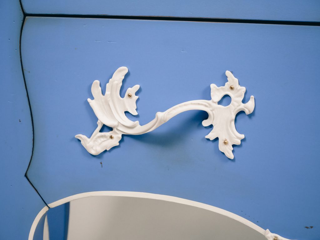 To achieve this feat, each bronze ornament was 3D-scanned, modeled, and then cast in porcelain, reproducing the details of the original designs with remarkable precision. The chest of drawers is finished in a pale blue inspired by Wedgwood, a subtle tribute to the English manufacturer’s creations.
