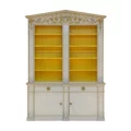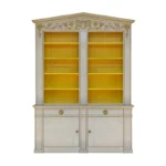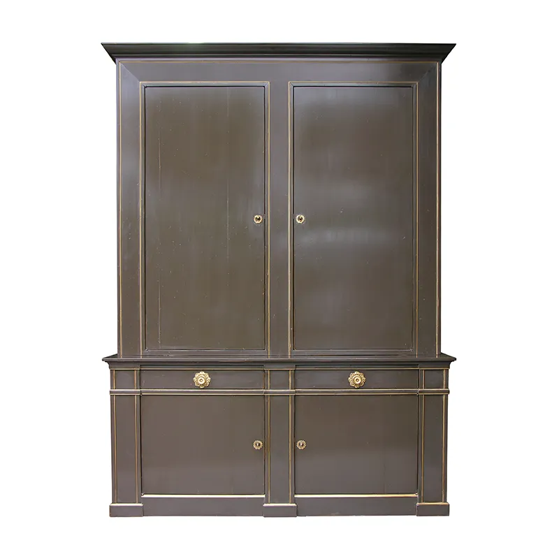 Commande spéciale. Deux corps. Corps du haut fermé. Huit rayons sur crémaillères. Corps du bas : deux portes panneautées, un rayon sur crémaillères. Hauteur totale : 232 cm.