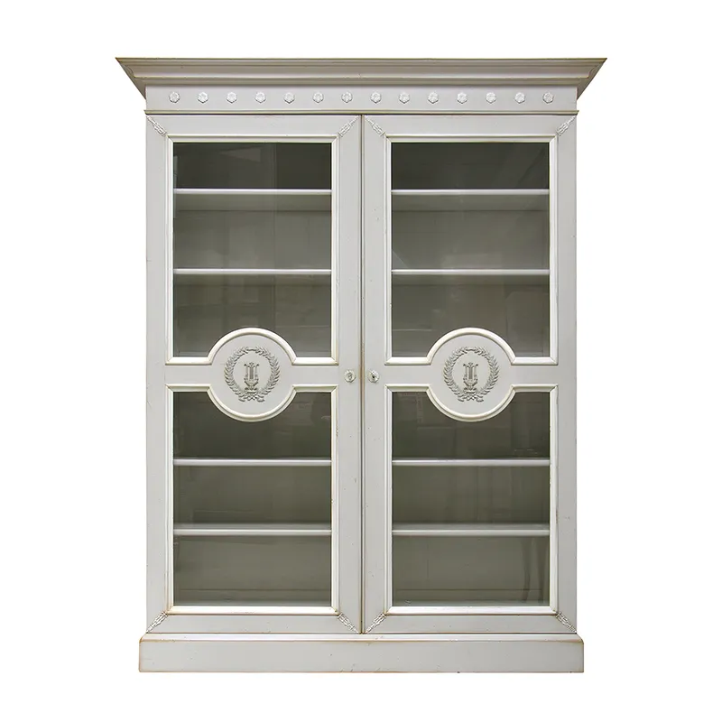 Sur plinthe, deux portes vitrées, moulurées, traverses centrales décorées de couronnes de laurier et lyre en bronze, traverse haute avec macarons bronze, quatre rayons intérieurs sur crémaillères.