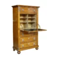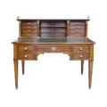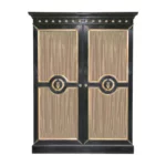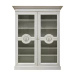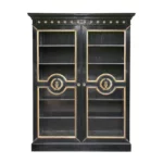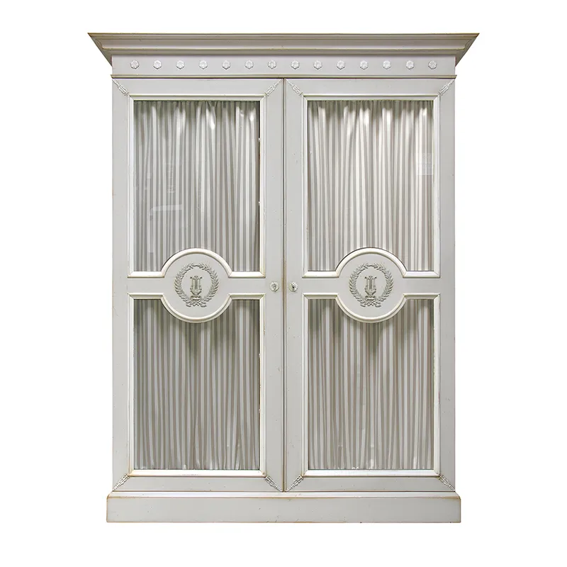Sur plinthe, deux portes vitrées, moulurées, traverses centrales décorées de couronnes de laurier et lyre en bronze, traverse haute avec macarons bronze, quatre rayons intérieurs sur crémaillères. Confection de rideaux en supplément.