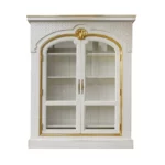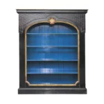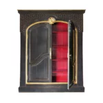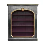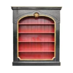 Partie haute guillochée et cloutée, importante sculpture coquille, cadre mouluré, intérieur comportant quatre rayons sur crémaillères, meuble sur plinthe.