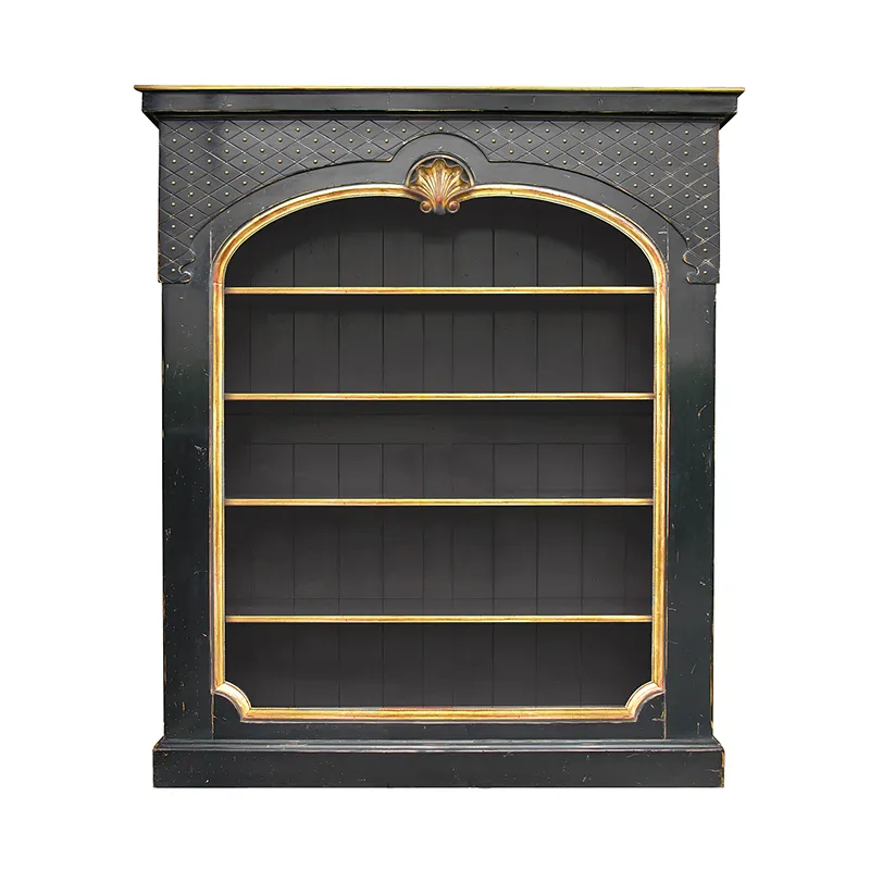 Partie haute guillochée et cloutée, importante sculpture coquille, cadre mouluré, intérieur comportant quatre rayons sur crémaillères, meuble sur plinthe.