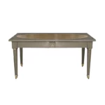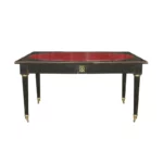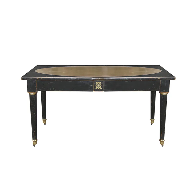 Dessus cuir de forme ovale, façade à deux grands tiroirs, pieds ronds, bagues, entrées et sabots en bronze.