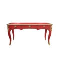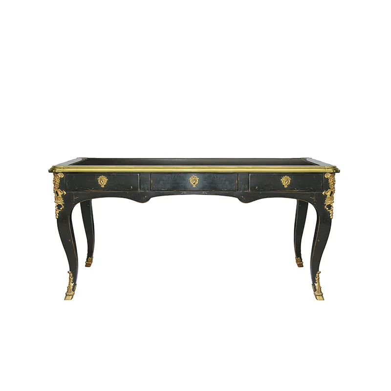 Trois tiroirs, pieds cambrés, dessus cuir, chutes, sabots et entrées en bronze.