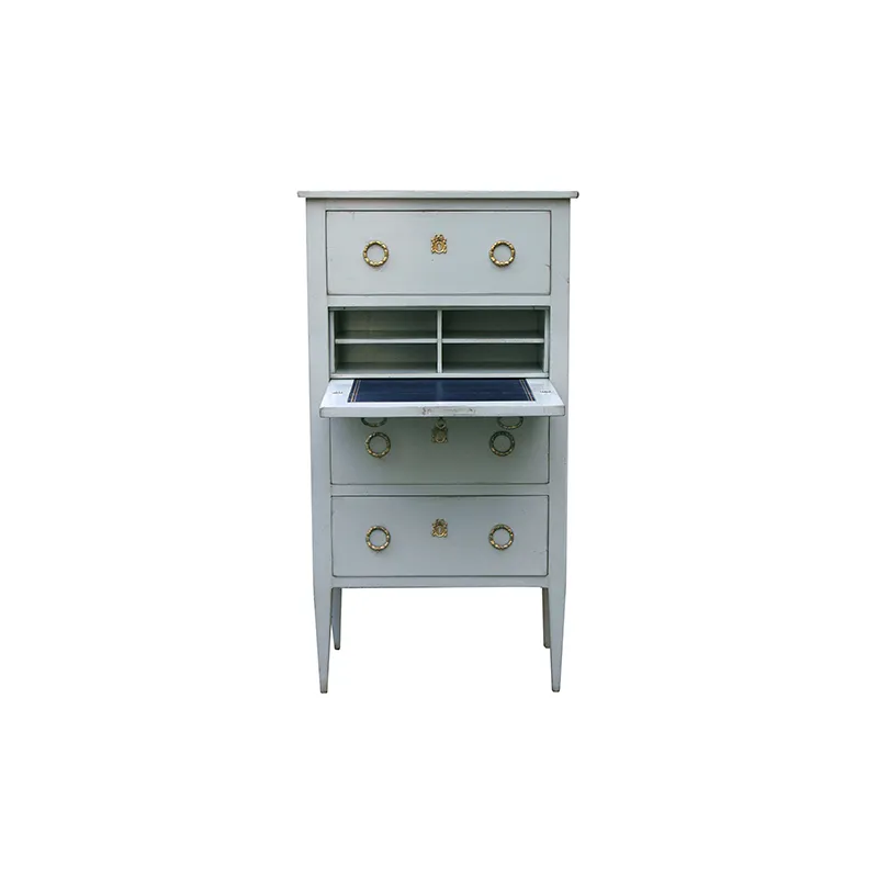 Quatre tiroirs dont un formant abattant gainé cuir, quatre casiers intérieurs.