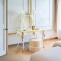 Miroir ovale pivotant supporté par deux colonnes en bois tourné, pieds cambrés, un grand tiroir, chutes, sabots et entrées en bronze. Abat-jours non fournis.
