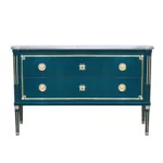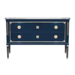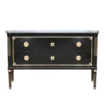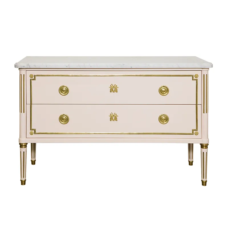 Deux grands tiroirs ornés d’une moulure et de rosaces en laiton, poignées, entrées et sabots en bronze, pieds cannelés, tiroirs sur coulisses métalliques. Dessus marbre.
