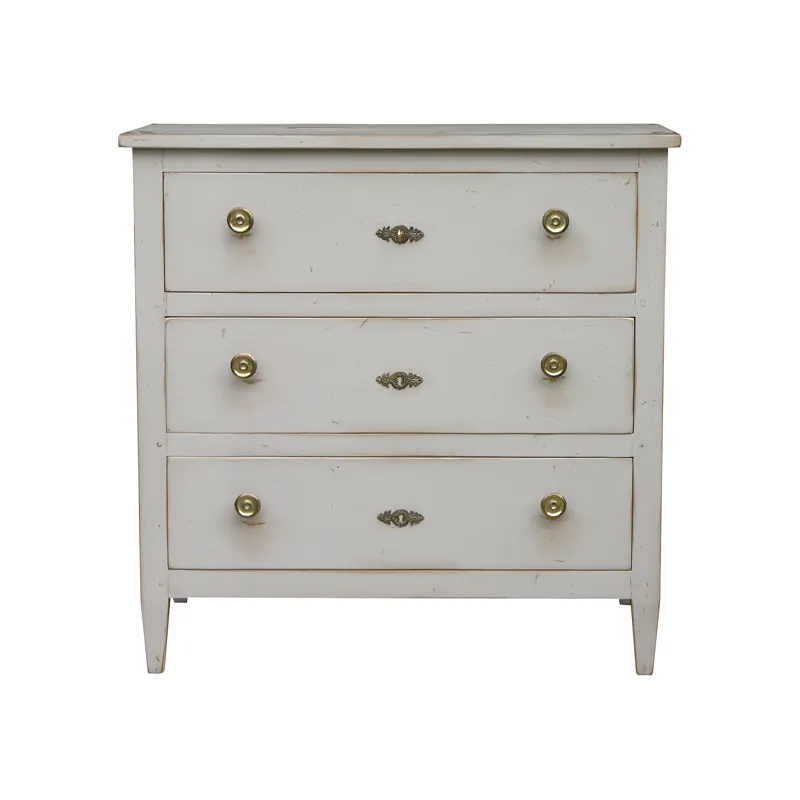 Trois tiroirs dont un formant abattant gainé cuir, quatre petits tiroirs intérieurs.