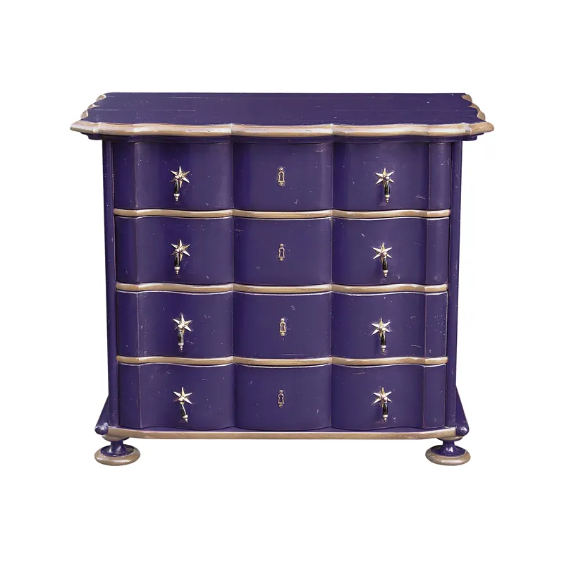 Quatre tiroirs galbés, poignées « glands » en laiton laqué, pieds rave.