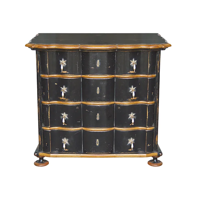 Quatre tiroirs galbés, poignées « glands » en laiton laqué, pieds rave.