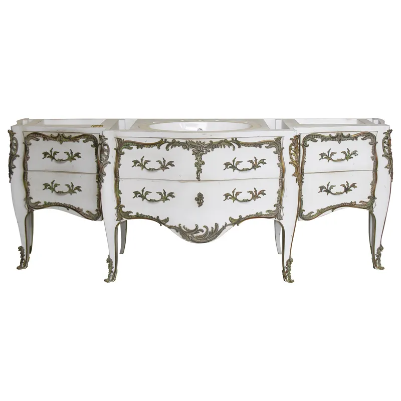 Commande spéciale. Meuble trois vasques. Façade à six tiroirs galbés, côtés galbés, dessus bois.