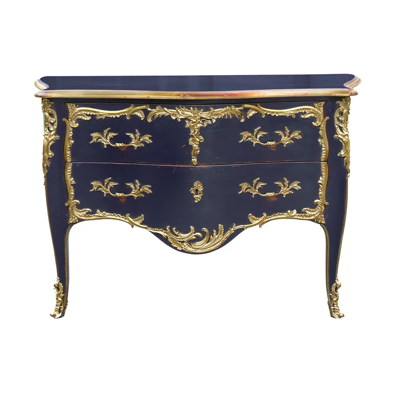 Dans le style de B.V.R.B., initiales par lesquelles Bernard II van Riesen Burgh (maître en 1735), les plus grand ébéniste parisien sous Louis XV, signait ses créations. Ses modèles personnifient le style rocaille dans son expression la plus parfaite. Façade à deux tiroirs galbés, côtés galbés, dessus bois.