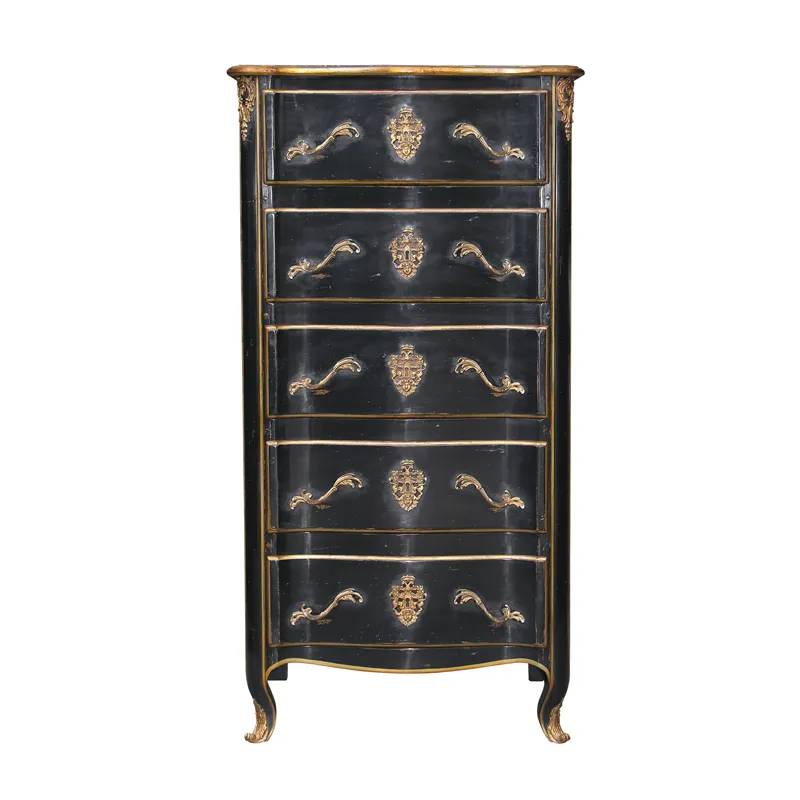 Commande spéciale. Dimensions spéciales : semainier. Cinq tiroirs galbés, dessus bois.