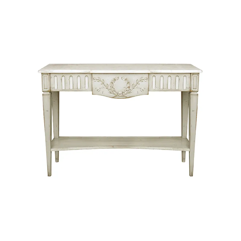 Accueil / Collection / Consoles et miroirs / Console Louis XVI Réf. 550 Console Louis XVI Réf. 550Un grand tiroir sculpté et cannelé. Référence550 BFinitionHêtre laqué grègeDimensionsL. 122 x P. 39,5 x H. 85 cmOù trouver ce produit ? Plus d’inspiration Console Louis XVI Réf. 550 Grand miroir de boiserie Louis XVI Réf. 801 Miroir Louis XVI Réf. 706 Fauteuil Louis XIV sculpté Réf. 142