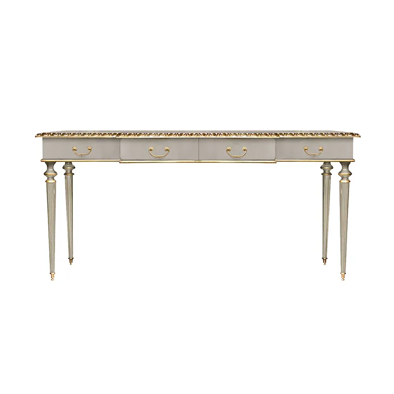 Quatre tiroirs à ressaut, pieds cannelés, frise sculptée.