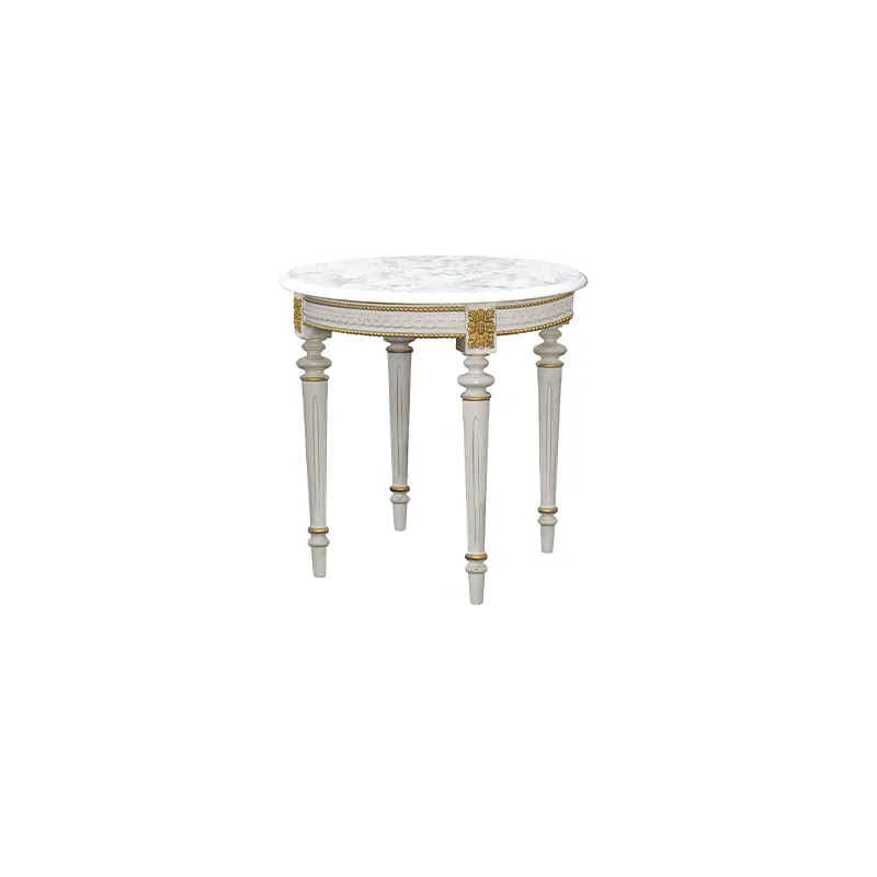 Rond, dessus marbre blanc, pieds cannelés, ceinture à décors d’entrelacs.