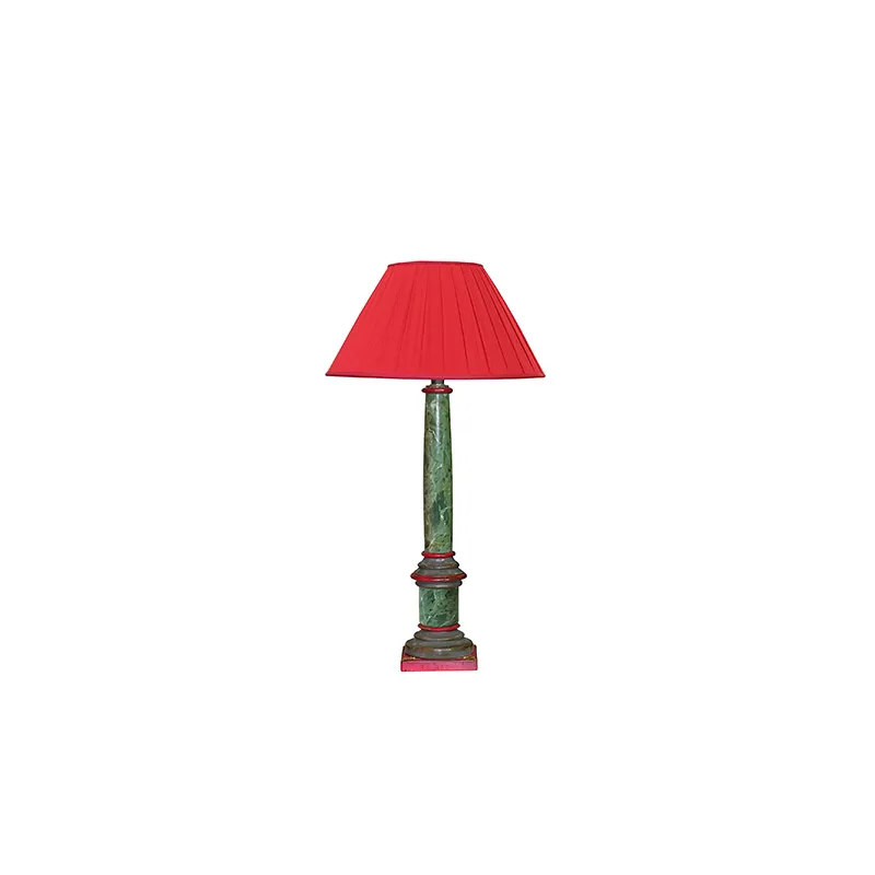 Pied en bois tourné, agrémenté de différents sujets de style Directoire. Décor peint faux marbre vert. Tissu abat-jour non fourni. Métrage pour un tissu uni en 140 cm de large : 2 m.