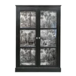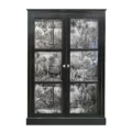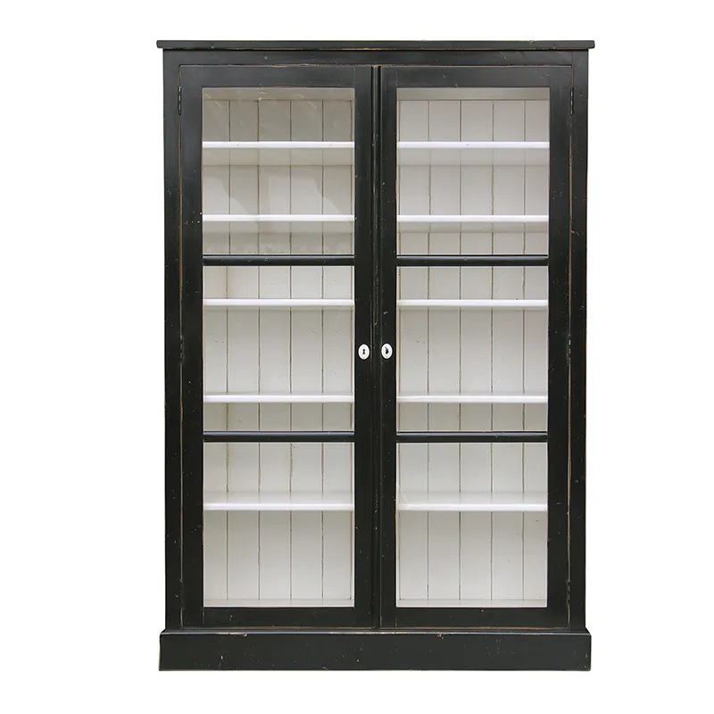 Ouvrant par deux portes vitrées, sur plinthe, cinq rayons sur crémaillères. Métrage pour un tissu uni en 140 cm de large pour la paire de rideaux : 2 m.
