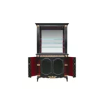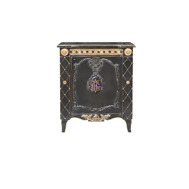 Ouvrant par une porte en façade et deux portes latérales. Rayons avec galerie en laiton, ornementation en bois, bronzes de style et monogramme. Dessus bois.