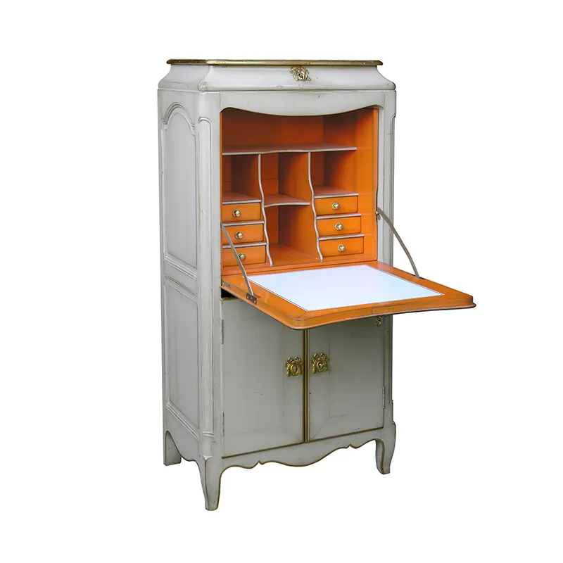 Un tiroir en doucine, abattant gainé de cuir, six tiroirs intérieurs en gradin. Profondeur ouvert : 90 cm. Deux portes sous l’abattant.