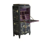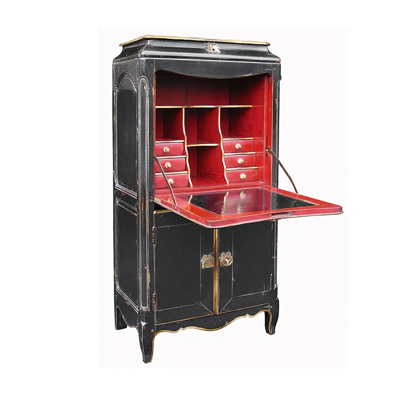 Un tiroir en doucine, abattant gainé de cuir, six tiroirs intérieurs en gradin. Profondeur ouvert : 90 cm. Deux portes sous l’abattant.