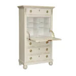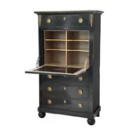 Dessus marbre noir de France ou dessus bois, quatre tiroirs, six casiers intérieurs, abattant gainé cuir, pieds raves à l’avant. Profondeur ouvert : 83,5 cm.