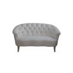 Sofa deux personnes galbé et capitonné. Hauteur d’assise 38 cm. Métrage pour un tissu uni en 140 cm de large : 7 m.