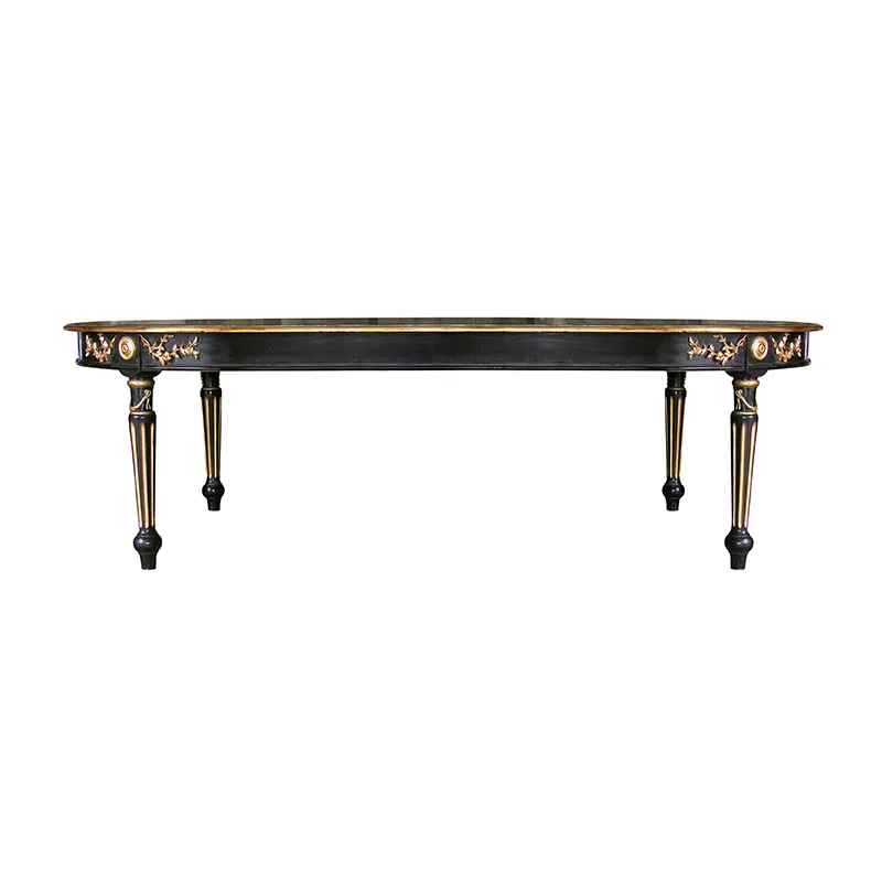 Commande spéciale. Forme oblongue. Quatre pieds ornementés et traverses avec motifs floraux. Dessus bois. Sans allonge.