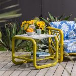 Structure en hêtre laqué. Traitement outdoor. Plateau en marbre Bleu de Savoie, finition adoucie, sablage au dessin de treillage. Plateau inférieur à motif treillage. La collection French Garden a été imaginée par le designer Pierre Gonalons.
