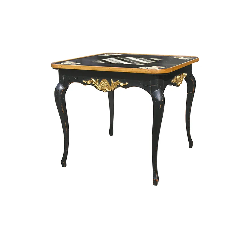 Pieds cambrés, ceinture agrémentée d’une coquille en bronze, dessus réversible : une face jeu d’échecs peint et décor de cartes, l’autre face gainée de cuir.