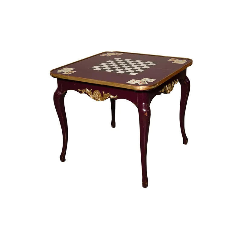 Pieds cambrés, ceinture agrémentée d’une coquille en bronze, dessus réversible : une face jeu d’échecs peint et décor de cartes, l’autre face gainée de cuir.