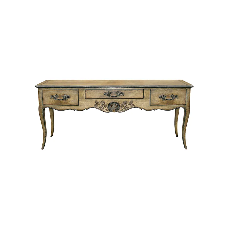 Dessus bois, trois tiroirs, traverse sculptée, pieds cambrés.