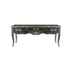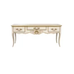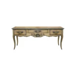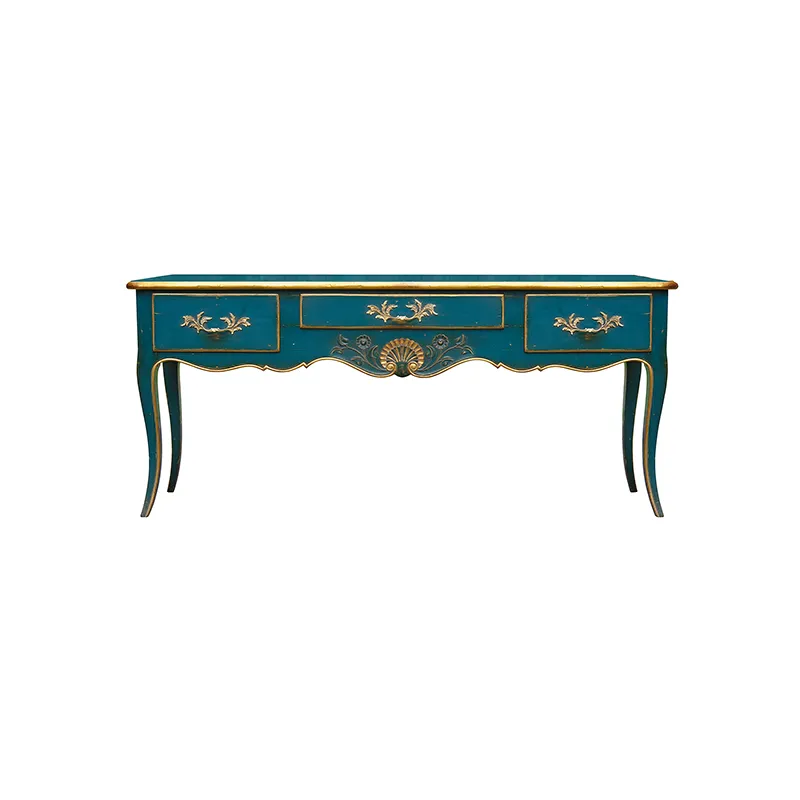 Dessus bois, trois tiroirs, traverse sculptée, pieds cambrés.