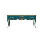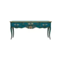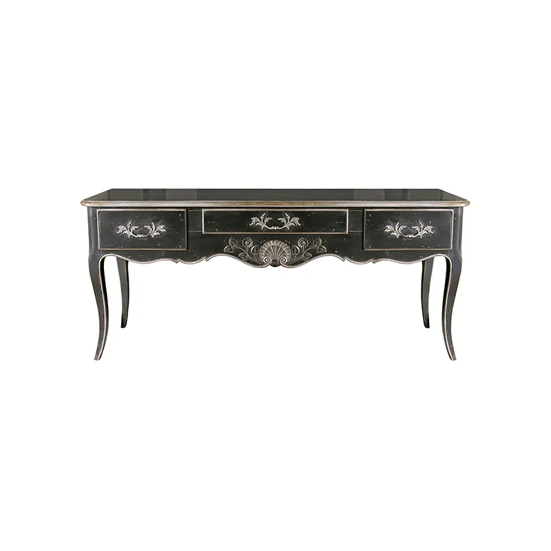 Dessus bois, trois tiroirs, traverse sculptée, pieds cambrés.