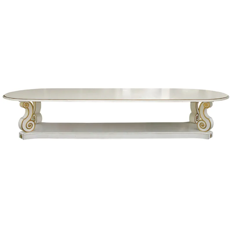 Commande spéciale. Dimensions spéciales. Quatre pieds console reposant sur un socle mouluré. Pour 12-14 personnes.