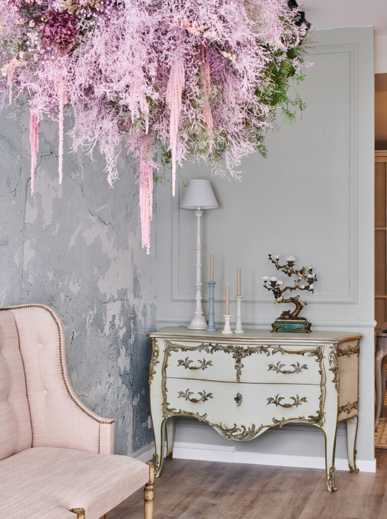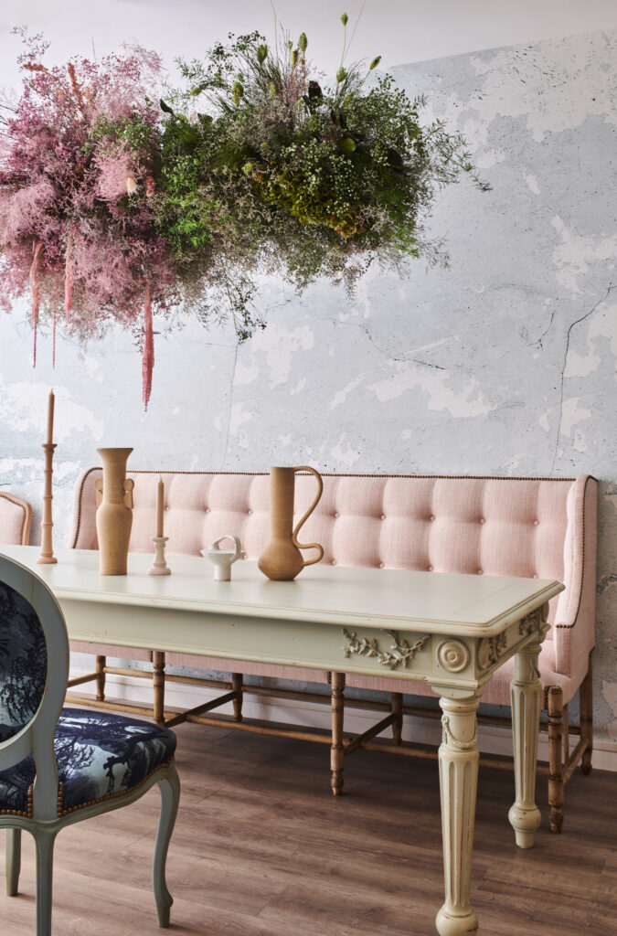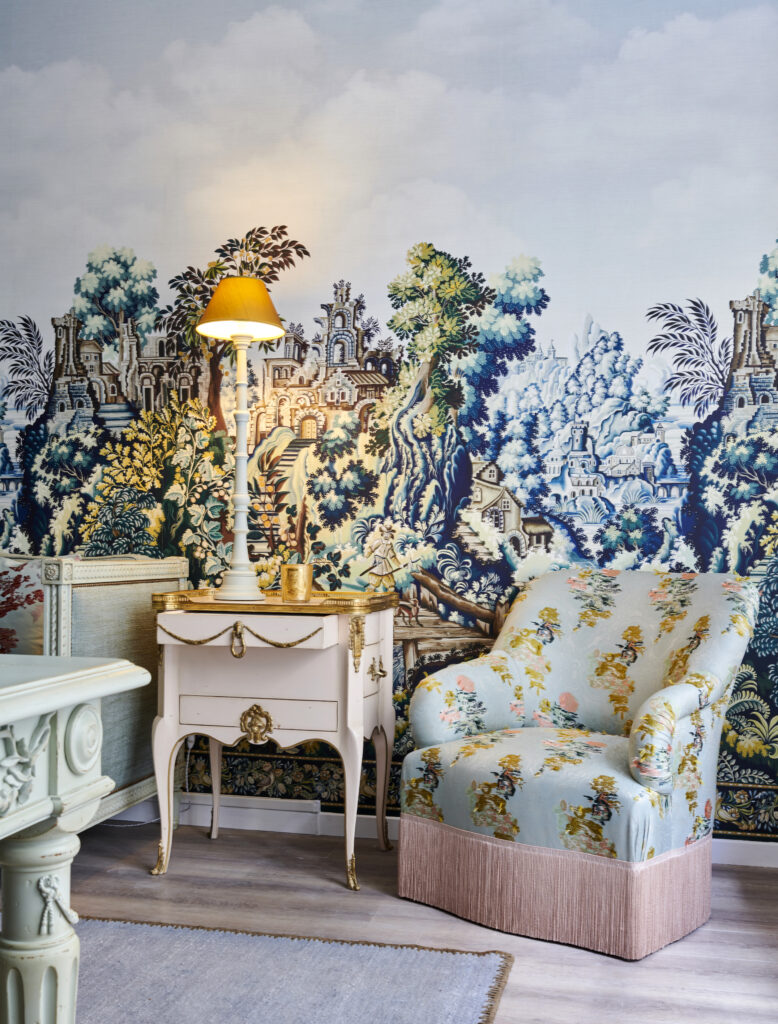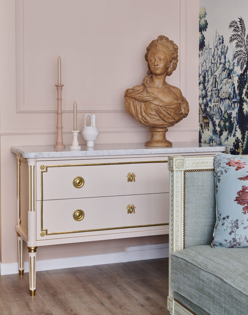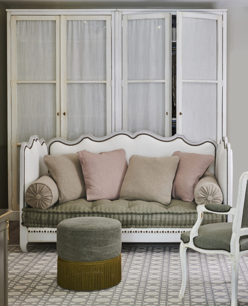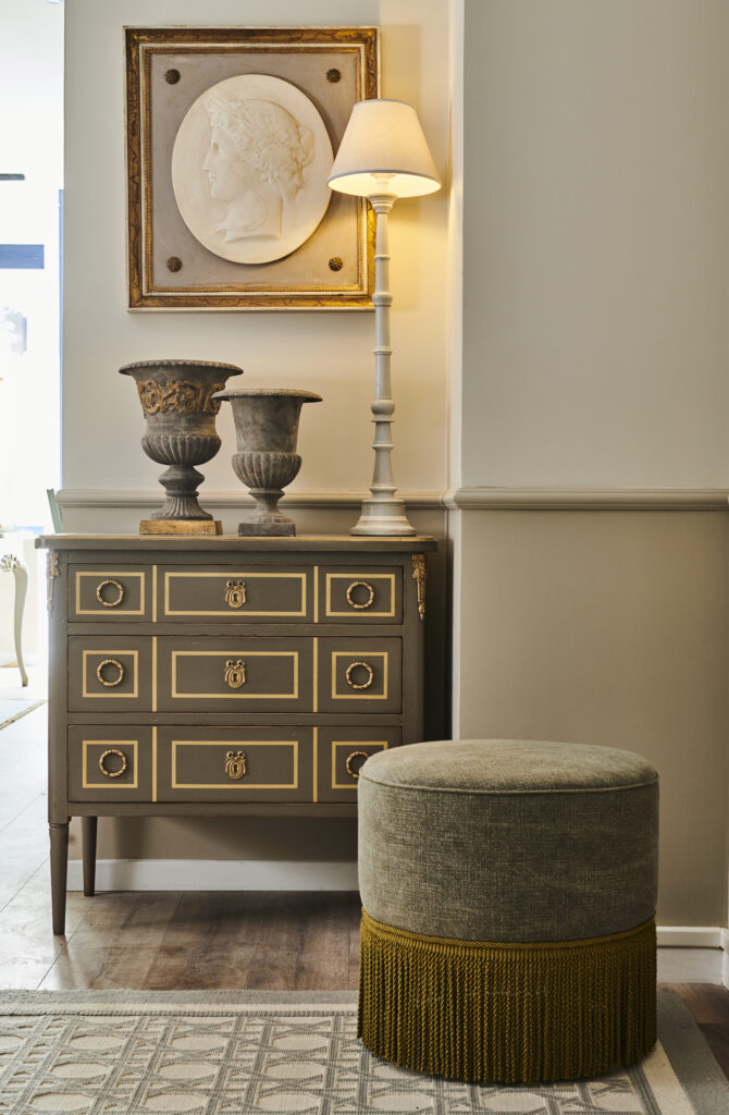 Dans cette ancienne demeure, chaque génération a laissé son empreinte. Les styles se rencontrent et se mêlent avec naturel : une table Napoléon III côtoie une banquette Louis XIV, un fauteuil crapaud en soierie XVIIIe répond à une commode Louis XVI. Les matières brutes s’associent aux étoffes raffinées, les teintes douces blanc, mastic, taupe apaisent et inspirent.