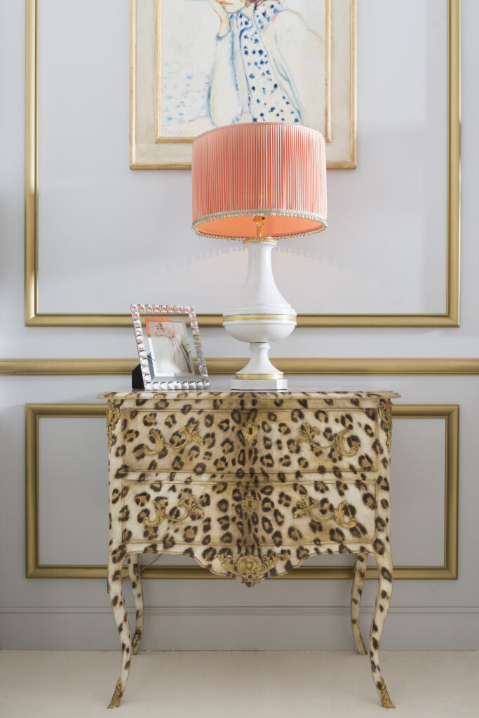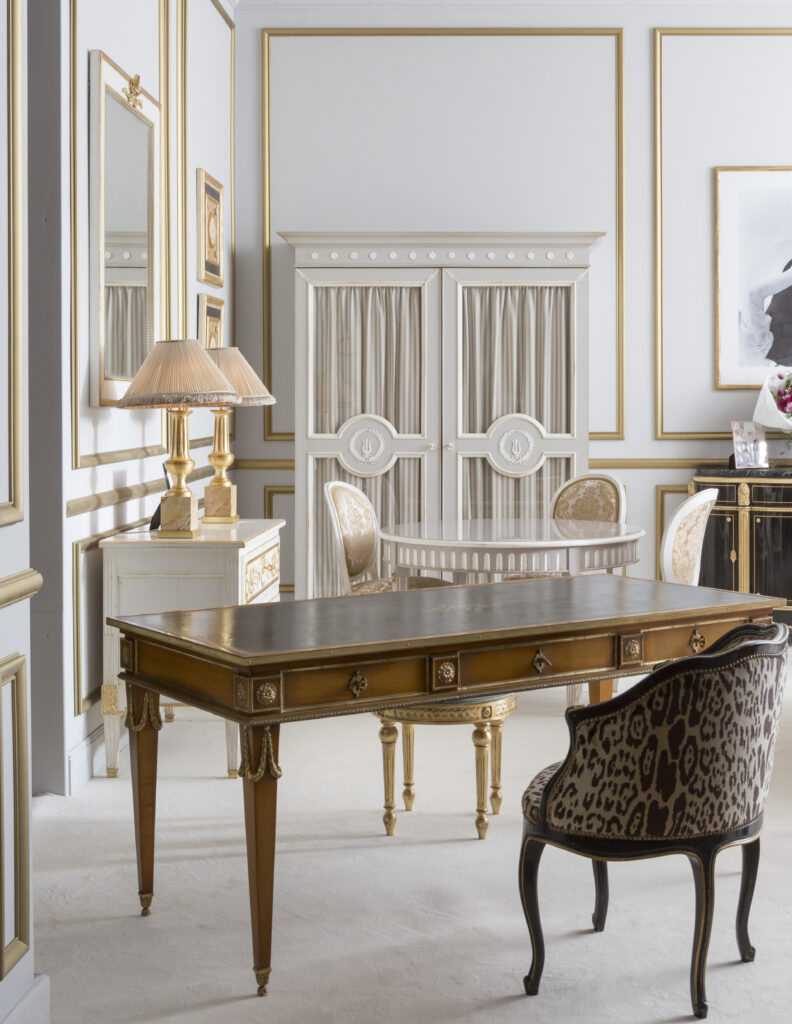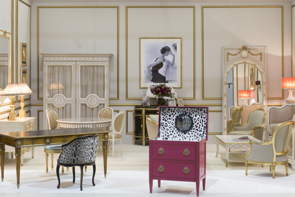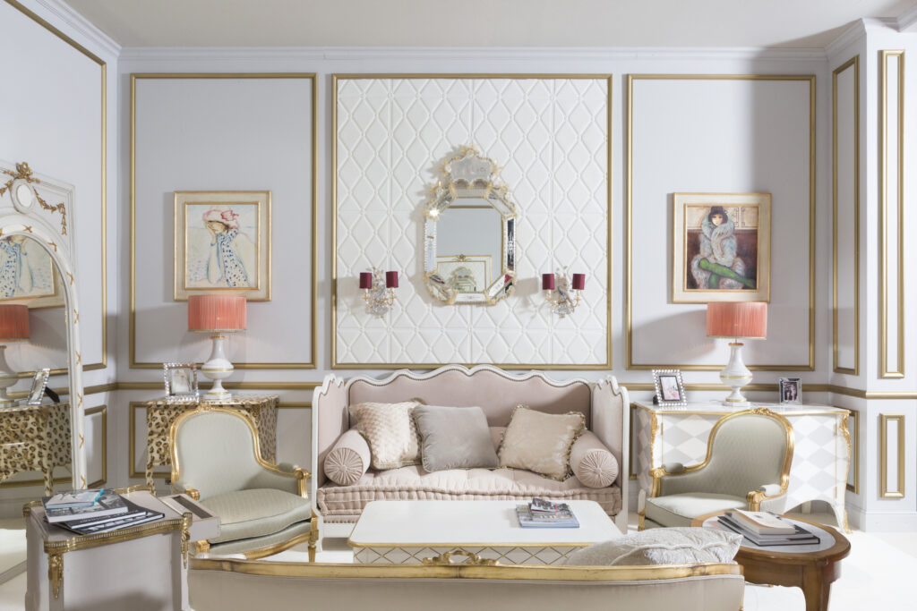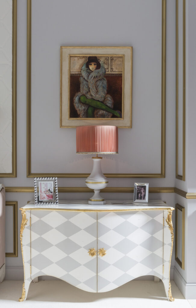 L’art de vivre à la française est à l’honneur. Il rayonne dans ce salon qui évoque celui d’une maison de haute couture. Il s’exprime dans le bois finement sculpté d’un grand trumeau détourné en miroir à poser au sol ou d’une banquette en corbeille Louis XVI. Les boiseries gris perle soulignées de blanc et or, rendent hommage au goût de Monsieur Dior. C’est une base indémodable sur laquelle toutes les fantaisies sont permises.